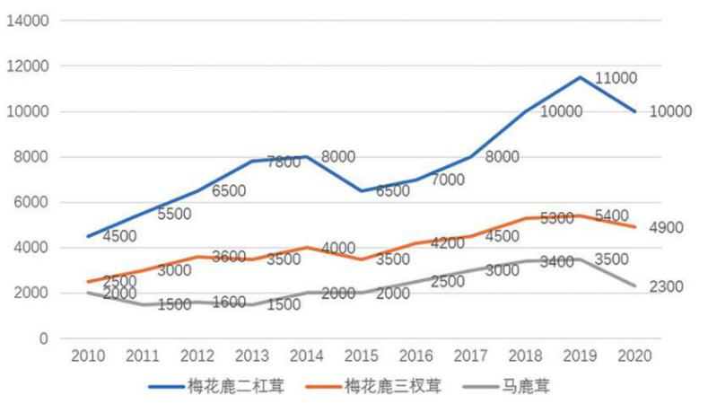 圖1- 2010—2020 年中國梅花鹿、馬鹿鹿茸市場價格變化(干茸,元/kg)
