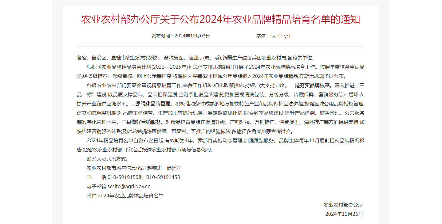 2024年精品培育名單自發(fā)布之日起,有效期為4年。我部將實施動態(tài)管理,加強跟蹤服務(wù)。品牌主體每年11月底前提交品牌情況報告,經(jīng)省級農(nóng)業(yè)農(nóng)村部門審定后報送農(nóng)業(yè)農(nóng)村部市場與信息化司。