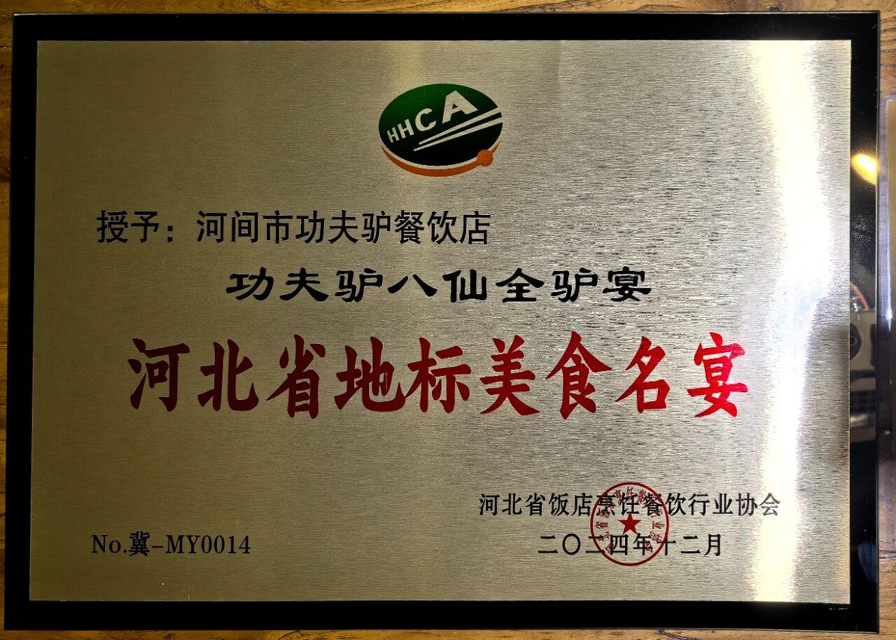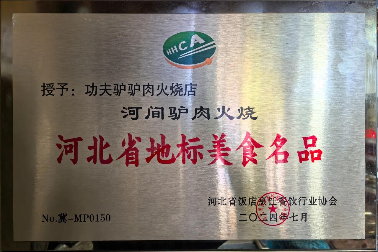 2024年,功夫驢驢肉火燒入選首批“河北省地標(biāo)美食”;“燕趙名品”;“滄州手信”。功夫驢全驢宴被評(píng)為河北地標(biāo)名宴,功夫驢黃芪紅湯燴金錢、功夫驢驢肉辣醬被評(píng)為河北地標(biāo)名菜。