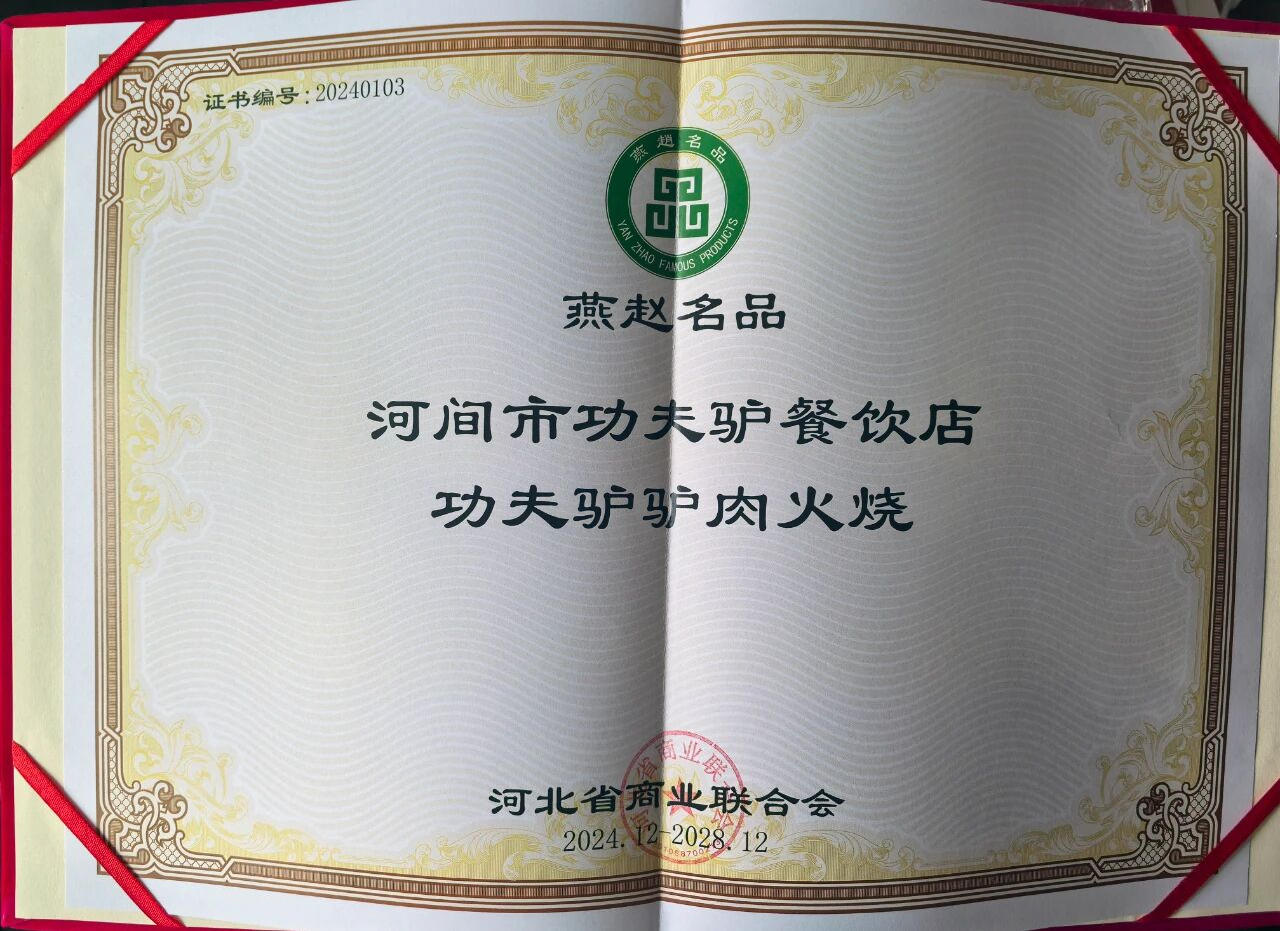 河間驢肉火燒制作技藝在2012年入選河北省非物質(zhì)文化遺產(chǎn),功夫驢傳統(tǒng)醬驢肉也于2025年入選市級(jí)非物質(zhì)文化遺產(chǎn)。功夫驢同時(shí)擁有兩個(gè)非遺的制作技藝,成為地方飲食文化的 “活化石”。