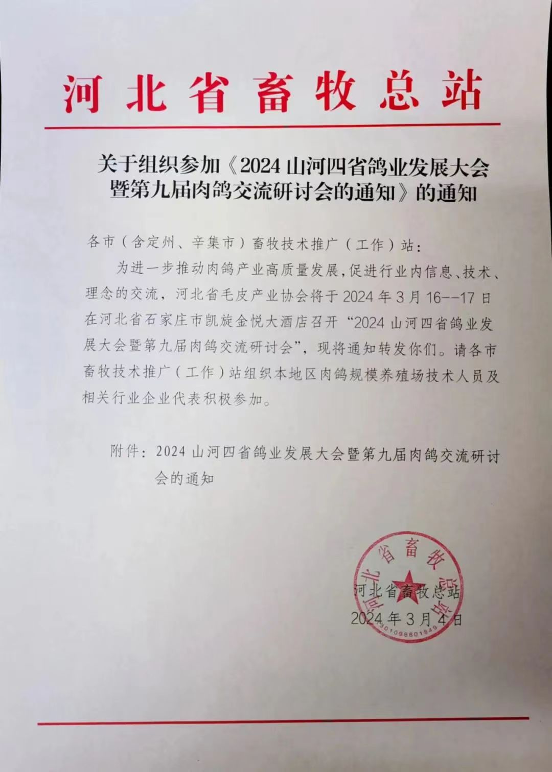 關(guān)于舉辦2024山河四省鴿業(yè)發(fā)展大會(huì)暨第九屆肉鴿交流研討會(huì)的通知