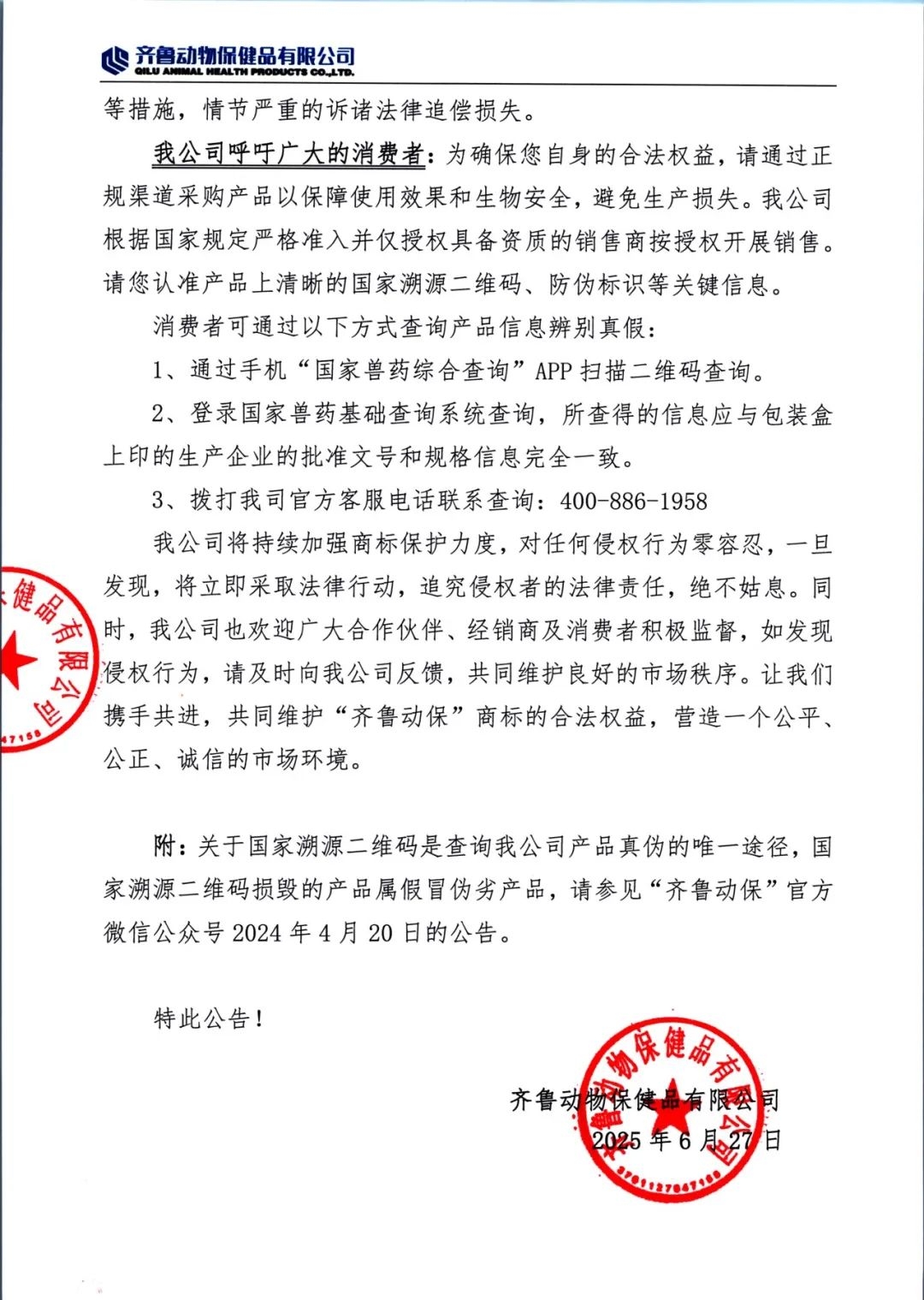 齊魯動(dòng)保關(guān)于嚴(yán)厲打擊商標(biāo)侵權(quán)及損毀溯源二維碼行為的公告