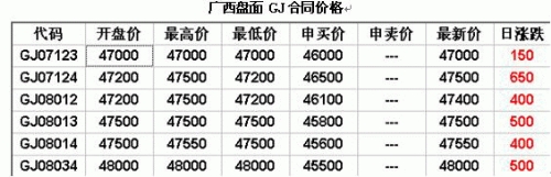 廣西盤面GJ成交量較昨日有所萎縮,總持倉量則與昨日持平,價格在上周陰跌調(diào)整后,本周又開始恢復(fù)為“小碎步”似的上漲,從上周下跌程度來看,SS08034從171500元/噸跌至176500元176950元,較前周下跌1700元,跌幅將近1%,近周GJ07123則以平盤不漲不跌方式平穩(wěn)渡過了技術(shù)調(diào)整期。近周GJ合同的抗跌性表現(xiàn)得淋漓盡致。隨著秋繭收購的結(jié)束,現(xiàn)貨干繭基本面利多消息頻傳,客觀上也推動了GJ合同上行。廣西盤面GJ合同自12月始便進(jìn)入上升通道,且盤面偏多的趨勢至今仍未改變,但筆者認(rèn)為:隨著干繭價格不斷的小幅上漲,前期受恐慌氣氛拖累GJ價格已經(jīng)逐步調(diào)整到位,未來GJ上漲空間已不大,或者說向下或橫盤的可能要大于突破5萬價位的可能,追高的風(fēng)險較大。