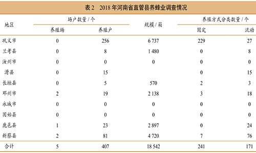 注:養(yǎng)殖場為養(yǎng)殖規(guī)模大,有固定養(yǎng)殖場所,以單位形式經(jīng)營;養(yǎng)殖戶為以個(gè)人或家庭為主,養(yǎng)殖規(guī)模小,以個(gè)體形式經(jīng)營;固定養(yǎng)殖方式為固定在某地養(yǎng)殖,多為養(yǎng)殖場和養(yǎng)殖戶大戶;流動方式為受花期、季節(jié)等因素影響,轉(zhuǎn)地養(yǎng)殖,多為養(yǎng)殖戶。