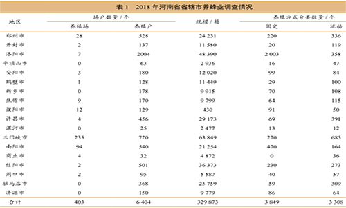 我國是全球第一養(yǎng)蜂大國,蜂群規(guī)模大,蜂蜜、蜂王漿、蜂膠等蜂產(chǎn)品產(chǎn)量均居世界首位。養(yǎng)蜂業(yè)也是農(nóng)業(yè)的重要組成部分,對于促進(jìn)農(nóng)民增收、提高農(nóng)作物產(chǎn)量和維護(hù)生態(tài)平衡具有重要意義。為加強(qiáng)對養(yǎng)蜂業(yè)發(fā)展的管理與指導(dǎo),推動產(chǎn)業(yè)持續(xù)健康穩(wěn)定發(fā)展,結(jié)合養(yǎng)蜂業(yè)發(fā)展實(shí)際,農(nóng)業(yè)部編制了《全國養(yǎng)蜂業(yè)”十二五"發(fā)展規(guī)劃》, 這是我國首次將養(yǎng)蜂業(yè)列入”五年規(guī)劃"。為了解河南省養(yǎng)蜂業(yè)的生產(chǎn)管理現(xiàn)狀,保障蜂產(chǎn)品質(zhì)量安全, 2018年對全省18個(gè)省轄市和10個(gè)省直管縣開展了調(diào)研。