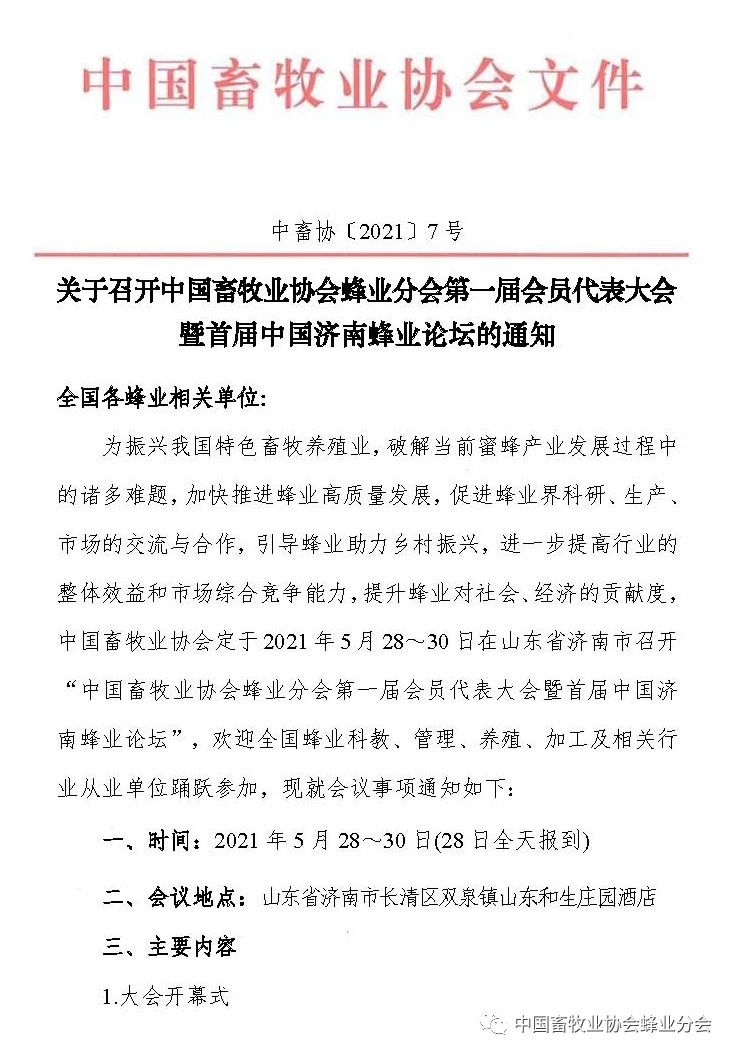 為振興我國特色畜牧養(yǎng)殖業(yè),破解當前蜜蜂產(chǎn)業(yè)發(fā)展過程中的諸多難題,加快推進蜂業(yè)高質(zhì)量發(fā)展,促進蜂業(yè)界科研、生產(chǎn)、市場的交流與合作,引導蜂業(yè)助力鄉(xiāng)村振興,進一步提高行業(yè)的整體效益和市場綜合競爭能力,提升蜂業(yè)對社會、經(jīng)濟的貢獻度,中國畜牧業(yè)協(xié)會定于2021年5月28~30日在山東省濟南市長清區(qū)雙泉鎮(zhèn)山東和生莊園酒召開“中國畜牧業(yè)協(xié)會蜂業(yè)分會第一屆會員代表大會暨首屆中國濟南蜂業(yè)論壇”,歡迎全國蜂業(yè)科教、管理、養(yǎng)殖、加工及相關(guān)行業(yè)從業(yè)單位踴躍參加。