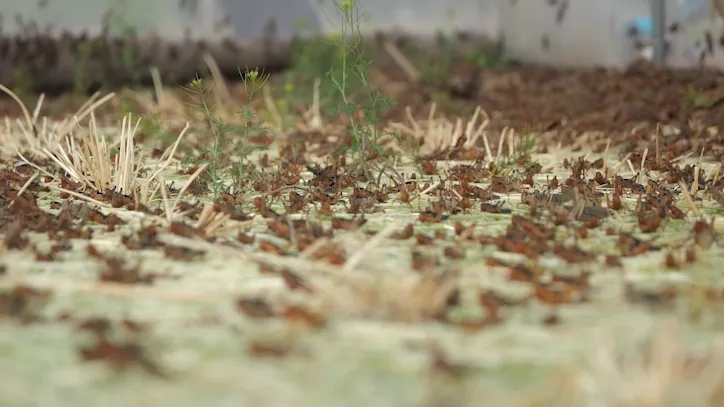 在馬呂村黨支部領(lǐng)創(chuàng)辦合作社,一排排白色拱棚格外引人注目。大棚內(nèi),密密麻麻的螞蚱四處飛舞,耳邊盡是“沙沙沙”的撲騰聲。