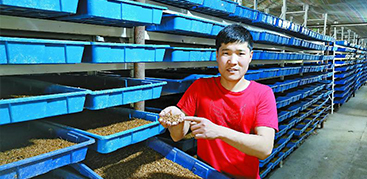 觀察昆蟲生長(zhǎng)狀況,調(diào)節(jié)合適的溫度、濕度,定時(shí)定量喂食……一大早,29歲的張廣杰就在新疆農(nóng)業(yè)大學(xué)駐瑪納斯縣科研基地的昆蟲養(yǎng)殖車間里忙碌起來?! ?/p>