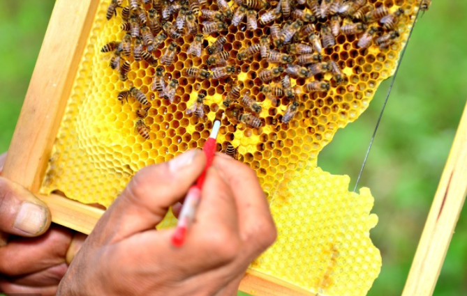 如果錯過這個時間段,小暑到立秋的芝麻花期必須把握,我們知道,一只蜂王的好壞,首先是基因,其次是蜂群的哺育力,工蜂只有在有蜜源的時候王漿腺才最發(fā)達,蜂王幼蟲得到了充足的營養(yǎng)才會成長為一只好王,所以,在芝麻大流蜜期,我們采用不間斷的獎飼方法,激發(fā)蜂群的采集情緒,采用強群大卵方法培育蜂王,通過遮陰和箱內(nèi)喂水、箱外噴水等降溫措施創(chuàng)造蜂場小環(huán)境,完全可以培育出高質(zhì)量的蜂王。