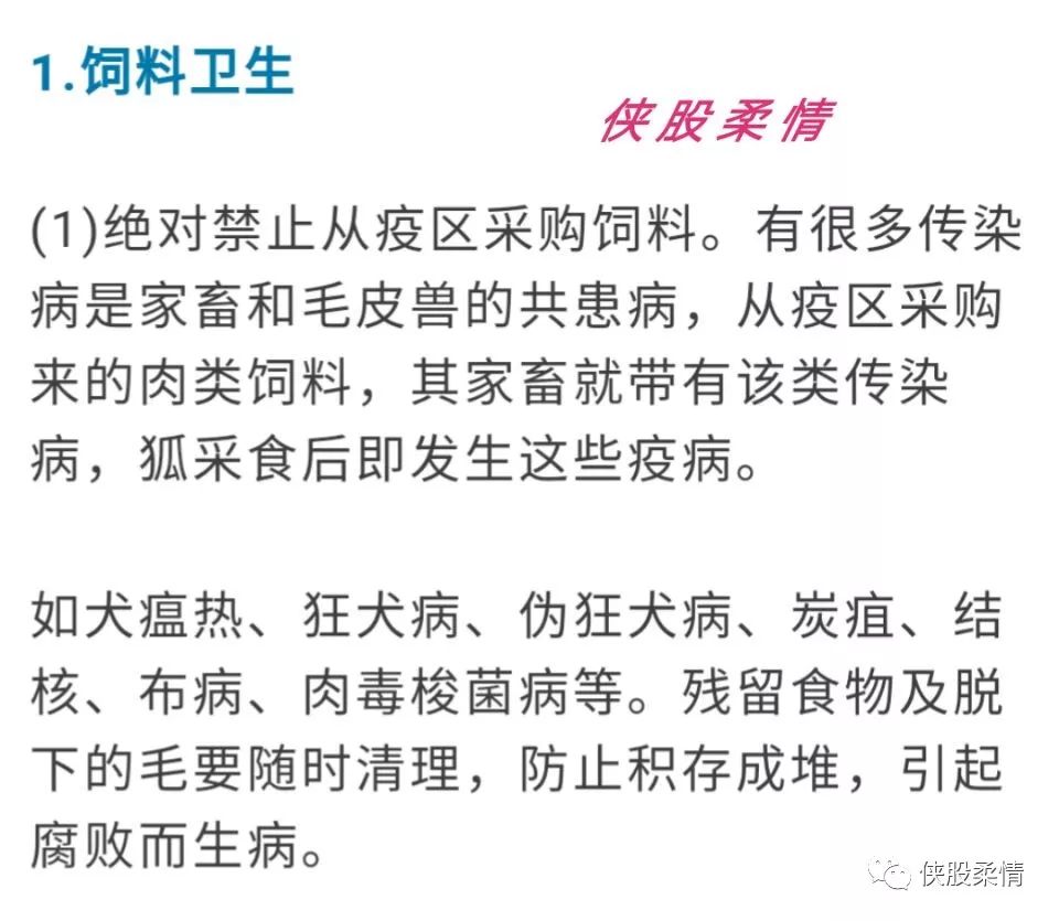 1.消滅傳染源,加強(qiáng)檢疫工作。引進(jìn)的狐,要隔離飼養(yǎng)兩周以上,或經(jīng)過必要的檢疫,沒有任何傳染病后方可入場(chǎng)。飼料、物品要從非疫區(qū)購(gòu)進(jìn),以免引起傳染病流行。
