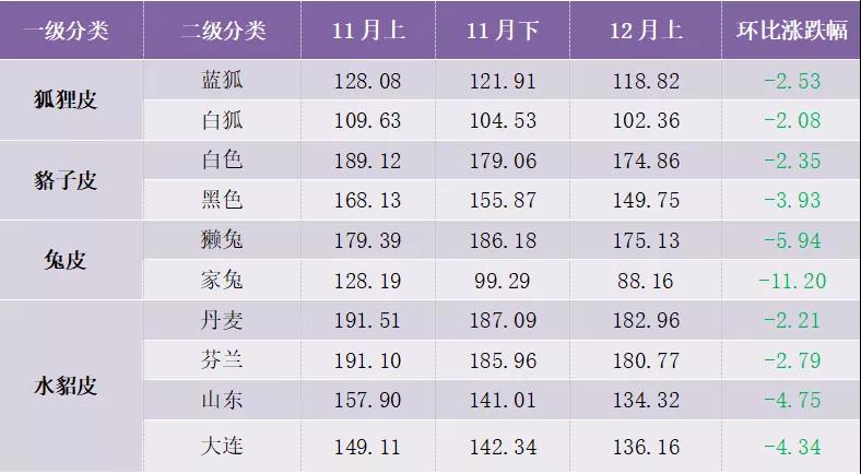 12月上半月,裘皮產(chǎn)品價(jià)格指數(shù)延續(xù)下滑態(tài)勢(shì)
