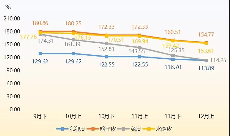 裘皮各品類產(chǎn)品價(jià)格指數(shù)中,兔皮產(chǎn)品價(jià)格指數(shù)下跌幅度最大,12月上半月收?qǐng)?bào)114.25點(diǎn),環(huán)比跌幅為8.86%,是裘皮產(chǎn)品價(jià)格總指數(shù)下滑的主要原因。貉子皮和水貂皮產(chǎn)品價(jià)格指數(shù)均延續(xù)下滑態(tài)勢(shì),12月上半月分別收?qǐng)?bào)154.77點(diǎn)和153.61點(diǎn),環(huán)比分別下滑3.58%和3.64%。狐貍皮產(chǎn)品價(jià)格指數(shù)跌幅相對(duì)較小,12月上半月價(jià)格指數(shù)小幅下滑收?qǐng)?bào)113.89點(diǎn),跌幅為2.41%。