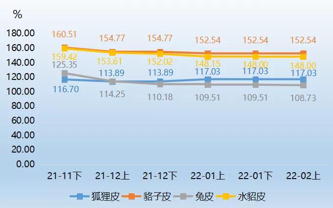 2022年2月上半月,獺兔皮產(chǎn)品價(jià)格指數(shù)小幅下滑收?qǐng)?bào)152.18點(diǎn),環(huán)比下跌1.67%,家兔皮產(chǎn)品價(jià)格指數(shù)收?qǐng)?bào)90.11點(diǎn),與上期持平。其余細(xì)分品類產(chǎn)品價(jià)格指數(shù)由于裘皮市場(chǎng)產(chǎn)品交易量減少,價(jià)格指數(shù)走勢(shì)平穩(wěn),均與上期持平。