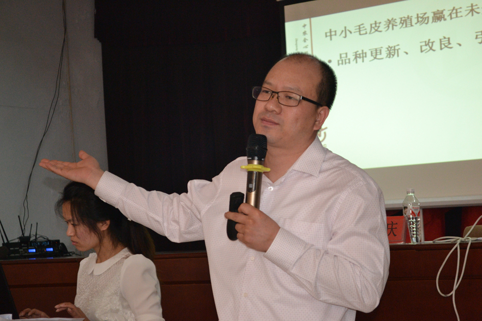 在第三版塊中,北京哈維思特飼料制造有限公司技術(shù)經(jīng)理李興閣做了《貉狐貂發(fā)泡配合飼料發(fā)展的探討》專題報告,從發(fā)泡配合飼料的優(yōu)點、發(fā)泡配合飼料的發(fā)展趨勢及發(fā)泡配合飼料的感官質(zhì)量要求等方面進行了分析;針對當前的形勢,河北省毛皮產(chǎn)業(yè)協(xié)會副會長、養(yǎng)殖委員會執(zhí)行主席、河北海原貂業(yè)總經(jīng)理艾興一做了《2014年毛皮行情形勢分析總結(jié)和2015年前景預測分析》的專題報告;河北省毛皮產(chǎn)業(yè)協(xié)會副秘書長、養(yǎng)殖委員會常務副主席、北京中農(nóng)同創(chuàng)生物科技有限公司董事長白江松針對當前中小養(yǎng)殖戶抗風險能力較差,做了《提高行業(yè)競爭力,提升中小養(yǎng)殖場抗風險能力》的專題報告,多層面、多角度進行了分析;齊魯動物保健品有限公司技術(shù)部經(jīng)理劉長浩做了《毛皮動物疾病預防及防治技術(shù)》,分析了當前養(yǎng)殖過程中存在的疾病問題及解決的辦法。各位嘉賓的演講聲情并茂,分析到位,不時贏得與會人員熱烈的掌聲。