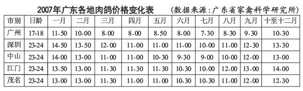 2007年廣東各地肉鴿價(jià)格變化表 (數(shù)據(jù)來源:廣東省家禽科學(xué)研究所)