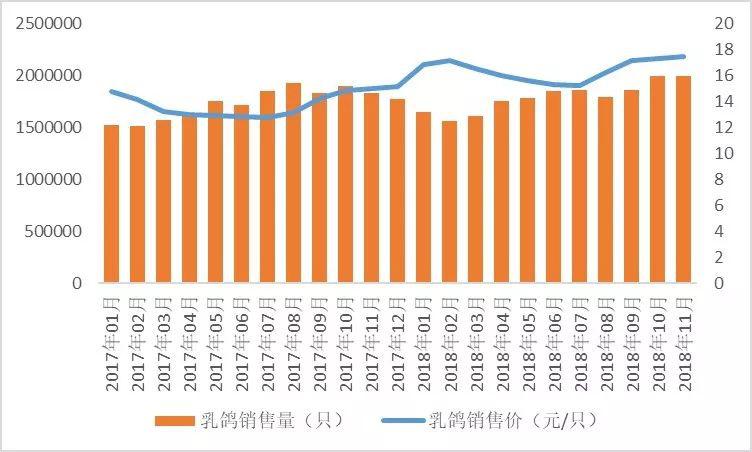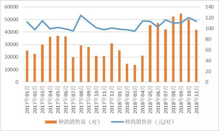 受非洲豬瘟和環(huán)保的雙重影響,全國家禽行業(yè)都迎來了超預期的高效益階段,在產(chǎn)種鴿存欄量也不斷提升。11月份,監(jiān)測企業(yè)種鴿存欄量約為140萬對,環(huán)比和同比均約增加0.7%,這個增幅并不大。從種鴿銷量上看,新增產(chǎn)能增速開始放緩,但產(chǎn)能增加的量仍高于去年同期,預計總供給仍會有顯著的增加。