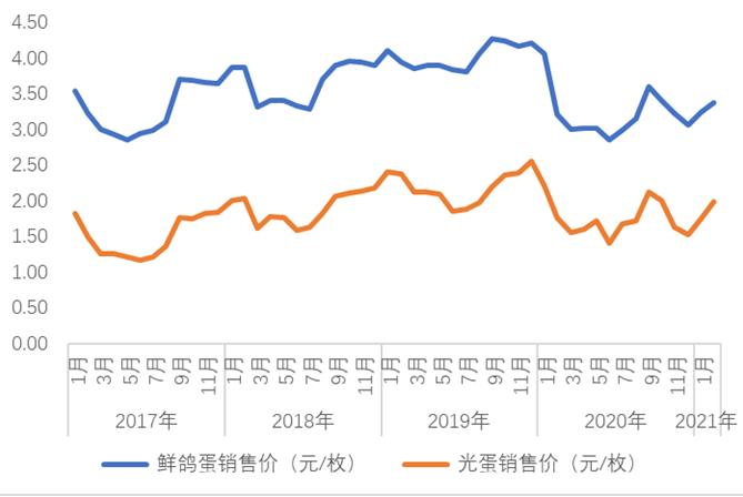 1、2月份監(jiān)測(cè)企業(yè)鴿蛋價(jià)格環(huán)比分別增加6%和4%,其中2月份鴿蛋平均價(jià)格增至3.38元/枚,絕大多數(shù)企業(yè)鴿蛋價(jià)格在3元/枚以上。