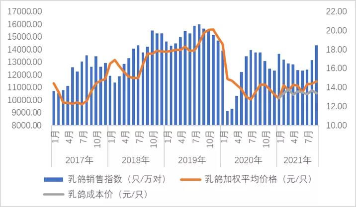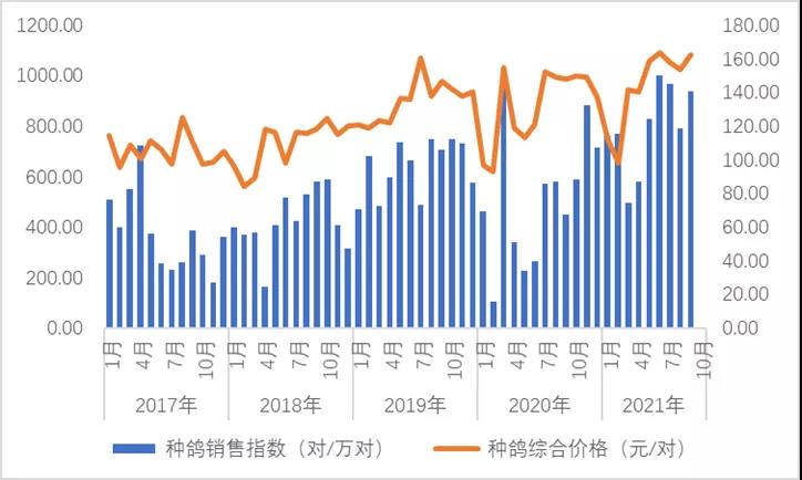 種鴿綜合價(jià)格為162.83元/對,環(huán)比增長6%,波動(dòng)指數(shù)為0.26,仍為一般波動(dòng)。監(jiān)測企業(yè)中,2-6月齡種鴿均有,價(jià)格差距極大;其中,最高價(jià)為230元/對,最低價(jià)為45元/對。銷售方面,種鴿銷售指數(shù)為939.09,環(huán)比增加約18%。從結(jié)構(gòu)上看,多數(shù)企業(yè)種鴿銷售有增加的趨勢。
