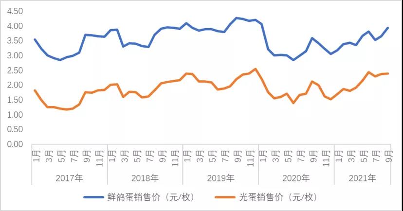 鴿蛋平均價(jià)格為3.93元/枚,環(huán)比上漲8%,波動(dòng)系數(shù)為1.2,為較大波動(dòng)。光蛋平均價(jià)格為2.39元/枚,環(huán)比上漲1%,波動(dòng)系數(shù)為0.04,為一般波動(dòng)。從結(jié)構(gòu)看,無論是鮮蛋還是光蛋,上漲的企業(yè)居多。鮮蛋最高價(jià)為6.5元/枚,最低價(jià)為2.7元/枚。