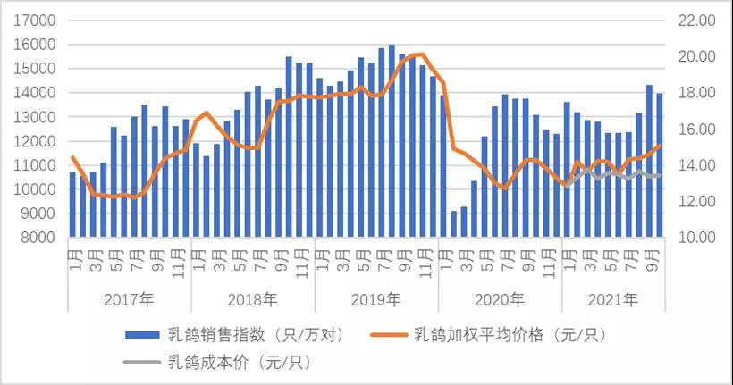 10月份,監(jiān)測(cè)企業(yè)乳鴿銷(xiāo)售指數(shù)為13959,環(huán)比下降2.56%。從同比看,乳鴿銷(xiāo)量水平僅次于2018年和2019年同期。從結(jié)構(gòu)看,銷(xiāo)量上漲和下滑的企業(yè)數(shù)量相等。價(jià)格方面,本期加權(quán)平均價(jià)格為15.11元/只,環(huán)比增加3.4%,價(jià)格波動(dòng)指數(shù)為0.64,為一般波動(dòng)。成本方面,監(jiān)測(cè)企業(yè)乳鴿成本沒(méi)有大的變化,維持在13.42元/只的水平,如果價(jià)格上漲利潤(rùn)會(huì)有所提升??偟膩?lái)看,天氣轉(zhuǎn)冷,北方乳鴿成活率下降,價(jià)格有上漲的空間。