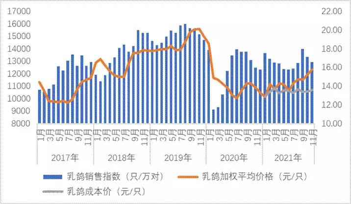 本期監(jiān)測企業(yè)乳鴿銷售指數(shù)為12923只/萬對,環(huán)比下降3%,環(huán)比波動指數(shù)為0.5,為正常調(diào)整。結(jié)構(gòu)上看,乳鴿銷量下降的企業(yè)約為上漲企業(yè)的一倍,總體表現(xiàn)為下降趨勢。價格方面,乳鴿平均價格為15.75元/只,環(huán)比增加3.56%,環(huán)比波動指數(shù)為0.63,屬于一般性波動。結(jié)構(gòu)上看,僅少數(shù)企業(yè)價格下調(diào),絕大多數(shù)為上調(diào)。最高價為22元/只,位于河南;最低價為11元/只,位于廣東。從成本看,近期乳鴿平均成本維持在13元/只的水平,因此整體看有較好的利潤表現(xiàn)。