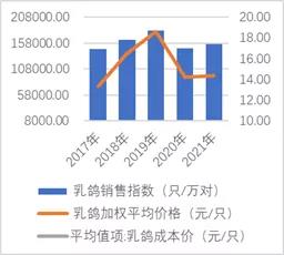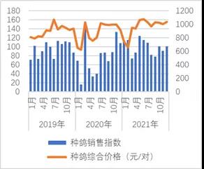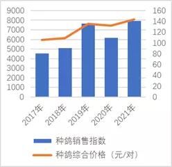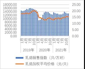 從年度看,本年度種鴿累計月銷售指數(shù)為7947(對/萬對),為近年來的最高水平。全年看,本年度種鴿綜合價格平均水平為140元/對,為近五年的最高水平。因此,本年度種鴿價格和銷量表現(xiàn)好于2020年。