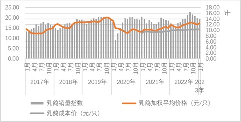 2023年1月份,監(jiān)測企業(yè)乳鴿銷量指數(萬對產鴿的乳鴿銷售只數)為13926.54,環(huán)比下降1.62%,為一般性波動。從2022年5月以來,乳鴿銷量環(huán)比波動幅度正常。價格方面,1月監(jiān)測企業(yè)乳鴿平均價格為17.49元/只,環(huán)比上漲5%,價格環(huán)比波動指數為1,表現出較大幅度的增長,春節(jié)效應超出預期。從成本看,1月份乳鴿成本價約為14.26元/只,環(huán)比下降約2%。