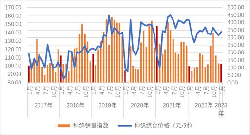 種鴿價格于2021年3月份開始上漲,二季度步入高位區(qū)間,2022年有所回落,但是價格仍然較高。2023年1月份,種鴿價格為140.79元/對,僅次于2022年同期的154.52元/對,高位開局。銷量方面,2022年種鴿銷售表現不佳,有價格方面的因素,也有疫情的影響。總體表現為高價格低銷量。2023年1月,監(jiān)測企業(yè)種鴿銷售指數(萬對產鴿的種鴿銷售對數)為123.45,與2017年以來的同期相比屬于中等水平,表現一般。但正常情況下,一季度的種鴿銷量普遍不高。