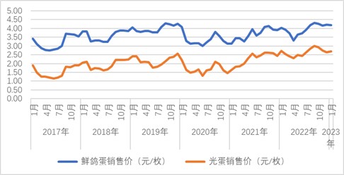 鴿蛋價格具有平穩(wěn)性特征,其平均水平為3.6元/枚。2021和2022年鴿蛋價格在均值以上,較為理想。2023年1月,監(jiān)測企業(yè)鮮鴿蛋平均價格為4.18元/枚,光蛋為2.70元/枚。其中,鮮鴿蛋環(huán)比下跌1%,光蛋上漲2%,兩者波動指數皆為一般性波動,屬于正常調整。且從結構上看,絕大多數企業(yè)鴿蛋價格持平。從季節(jié)性看,鴿蛋價格可能會進一步回落。