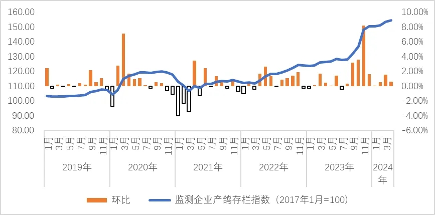 2024年4月,監(jiān)測企業(yè)產(chǎn)鴿存欄指數(shù)分別為154.31,環(huán)比上漲0.57%,為一般性波動。整體上,監(jiān)測企業(yè)產(chǎn)鴿存欄穩(wěn)中有升。結(jié)構(gòu)上看,本期最高漲幅為22%,個別企業(yè)下調(diào)幅度為2%