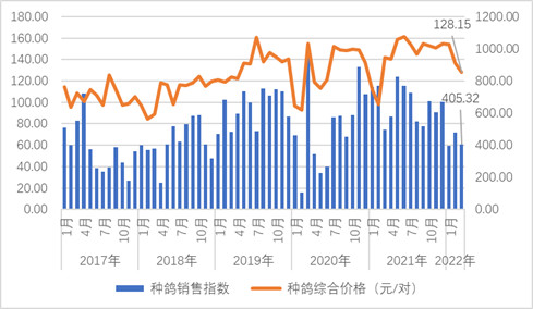 本期,監(jiān)測(cè)企業(yè)種鴿月平均綜合價(jià)格為128.15元/對(duì),環(huán)比下降6%。銷售指數(shù)為405.32,環(huán)比下降15%。從季節(jié)性看,種鴿3月份價(jià)格和銷量環(huán)比均有上調(diào)趨勢(shì),因此本期種鴿市場(chǎng)的低迷值得關(guān)注。從結(jié)構(gòu)看,有監(jiān)測(cè)企業(yè)因當(dāng)?shù)匾咔樵?,鴿產(chǎn)品無(wú)法銷售,進(jìn)而拉低了加權(quán)價(jià)格。但從其它企業(yè)的表現(xiàn)來(lái)看,正常銷售的企業(yè),種鴿價(jià)格不變,甚至是上調(diào),符合預(yù)期。銷量方面,與價(jià)格表現(xiàn)有所區(qū)別,增減企業(yè)數(shù)量差距不大,但下調(diào)企業(yè)的銷量更多,從而拉低了整體銷量下滑。一季度,種鴿季度平均價(jià)格為140元/對(duì),高于近五年同期水平。季度銷量指數(shù)為1280.54,處于近五年的低位。因此,從價(jià)格看,種鴿價(jià)位比較堅(jiān)挺,銷量隨著新冠肺炎疫情被有效控制后方有所緩解。