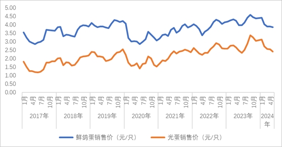 本期,監(jiān)測(cè)企業(yè)鴿蛋和光蛋平均價(jià)格分別為3.86元/枚和2.41元/枚,價(jià)格環(huán)比下跌1%和5%,均為一般性波動(dòng)。從趨勢(shì)看,鴿蛋價(jià)格已連續(xù)4個(gè)月下降。