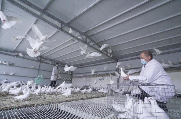 近日,在新疆巴音郭楞蒙古自治州和靜縣額勒再特烏魯鄉(xiāng)察汗烏蘇村,肉鴿養(yǎng)殖繁育基地的工作人員正在標(biāo)準(zhǔn)化養(yǎng)殖圈舍內(nèi)忙碌。該養(yǎng)殖場已孵化出今年第一批鴿苗共3000羽,預(yù)計(jì)4月