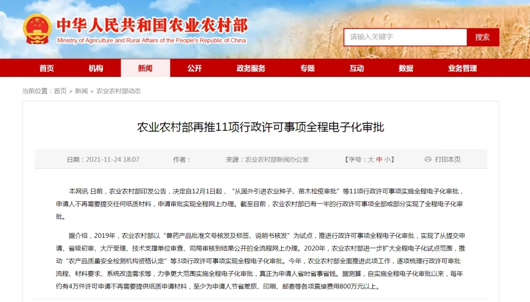 據(jù)介紹,2019年,農(nóng)業(yè)農(nóng)村部以“獸藥產(chǎn)品批準(zhǔn)文號核發(fā)及標(biāo)簽、說明書核發(fā)”為試點(diǎn),推進(jìn)行政許可事項(xiàng)全程電子化審批,實(shí)現(xiàn)了從提交申請、省級初審、大廳受理、技術(shù)支撐單位審查、司局審核到結(jié)果公開的全流程網(wǎng)上辦理。2020年,農(nóng)業(yè)農(nóng)村部進(jìn)一步擴(kuò)大全程電子化試點(diǎn)范圍,推動“農(nóng)產(chǎn)品質(zhì)量安全檢測機(jī)構(gòu)資格認(rèn)定”等3項(xiàng)行政許可事項(xiàng)實(shí)現(xiàn)全程電子化審批。2021年,農(nóng)業(yè)農(nóng)村部全面推進(jìn)此項(xiàng)工作,逐項(xiàng)梳理行政許可審批流程、材料要求、系統(tǒng)改造需求等,力爭更大范圍實(shí)施全程電子化審批,真正為申請人省時(shí)省事省錢。據(jù)測算,自實(shí)施全程電子化審批以來,每年約有4萬件許可申請不再需要提供紙質(zhì)申請材料,至少為申請人節(jié)省差旅、印刷、郵寄等各項(xiàng)直接費(fèi)用800萬元以上。