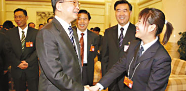昨日,溫家寶參加十一屆全國人大一次會議廣東代表團審議,與來自廣東佛山的農(nóng)民工代表胡小燕(右)握手。雷聲攝 歷史將記住這一時刻!作為本屆全國人大代表中的3個農(nóng)民工代