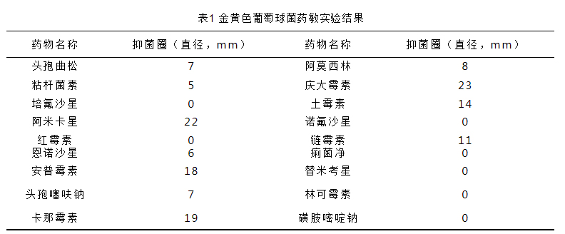表1 金黃色葡萄球菌藥敏實(shí)驗(yàn)結(jié)果