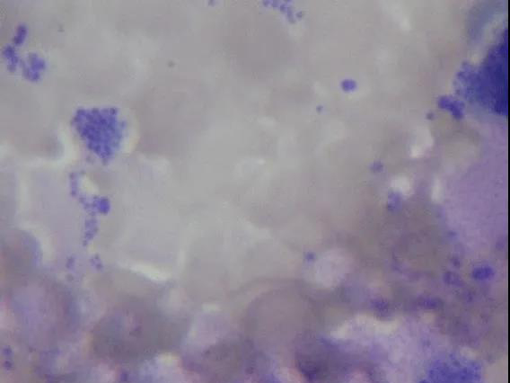 由圖2可見(jiàn),在視野中含有染色成為葡萄串樣的紫色球菌。