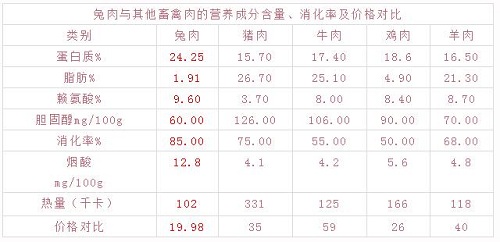 兔肉肌纖維鮮嫩細(xì)膩,易于消化吸收,更適宜老年人、兒童、胃口失調(diào)者以及消化功能弱者食用。從上可以看出,兔肉比牛肉、雞肉、羊肉、豬肉營養(yǎng)高,但價(jià)格沒有牛、羊、豬肉高。