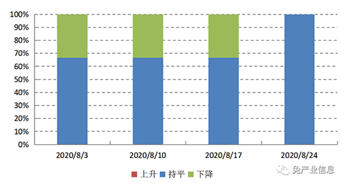 根據(jù)8月份集散地監(jiān)測結(jié)果,對于市場的未來走勢,大部分商戶持中立的態(tài)度。在8月份的四周中,沒有商戶認(rèn)為銷售情況會(huì)上升,75.00%的商戶認(rèn)為銷售情況會(huì)保持現(xiàn)狀,25.00%商戶認(rèn)為市場表現(xiàn)會(huì)下降,商戶總體態(tài)度中性偏消極(表2)