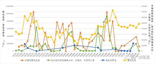 7月份整張兔皮進(jìn)口額為728.13萬元,較上月上升16.70%(圖7);未縫制整張兔皮進(jìn)口額為8.65萬元,較上月下降65.99%;兔毛制針織鉤編套頭衫、開襟衫、外穿背心等進(jìn)口額為0.30萬元,較上月下降97.70%。