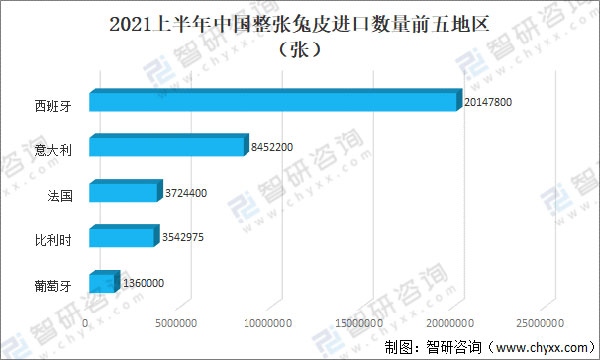 據(jù)中國海關(guān)數(shù)據(jù),2021上半年中國整張兔皮從西班牙地區(qū)進(jìn)口數(shù)量最多為20147800張,其次是從意大利地區(qū)進(jìn)口整張兔皮進(jìn)口數(shù)量為8452200張。