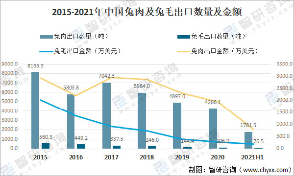2015-2021年中國兔肉及兔毛出口數(shù)量及金額