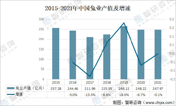 受供給側(cè)結(jié)構(gòu)性改革、環(huán)境保護(hù)政策等影響,我國兔業(yè)發(fā)展趨緩。2021年中國兔業(yè)產(chǎn)值約為247.97億元,同比下降0.1%。