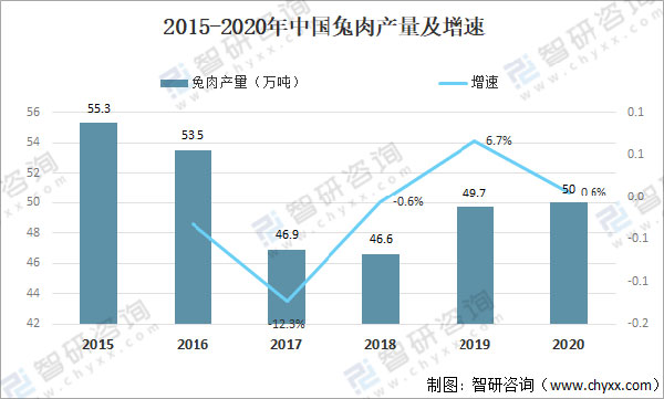 2015-2020年中國兔肉產(chǎn)量及增速