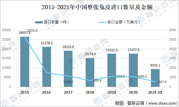 2015-2021年中國整張兔皮進(jìn)口數(shù)量及金額