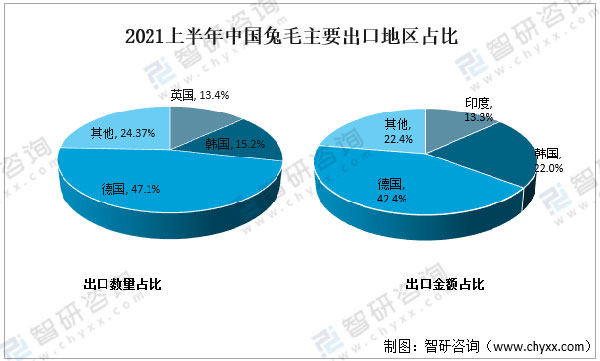 中國兔毛主要出口至德國、韓國及英國等地區(qū),其中2021上半年中國兔毛出口至德國數(shù)量為36020千克,占總兔毛出口數(shù)量的47.1%。
