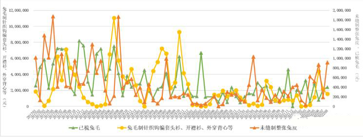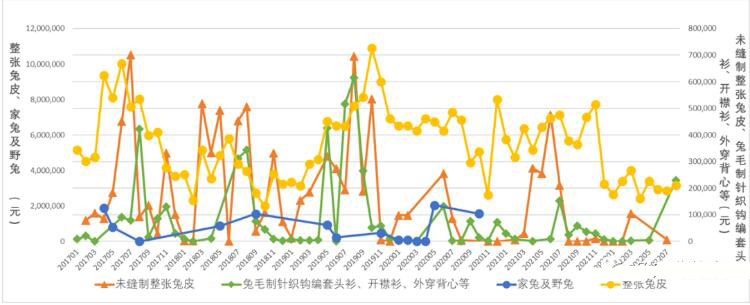 8月份整張兔皮進口額為315.68萬元,較上月上升10.81%;兔毛制針織鉤編套頭衫、開襟衫、外穿背心等進口額為22.87萬元(圖7)。