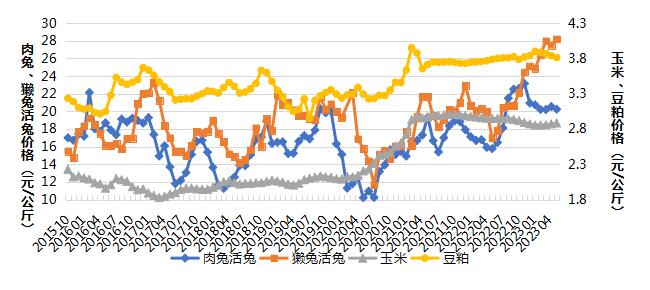圖2 2018年5月-2023年5月兔及兔產(chǎn)品價(jià)格走勢(shì)(右坐標(biāo)為兔毛價(jià)格)
