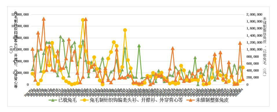 2023年4月份整張兔皮進(jìn)口額為241.07萬(wàn)元,較上月增加39.88%;未縫制整張兔皮進(jìn)口額為0.84萬(wàn)元(見(jiàn)圖7)。
