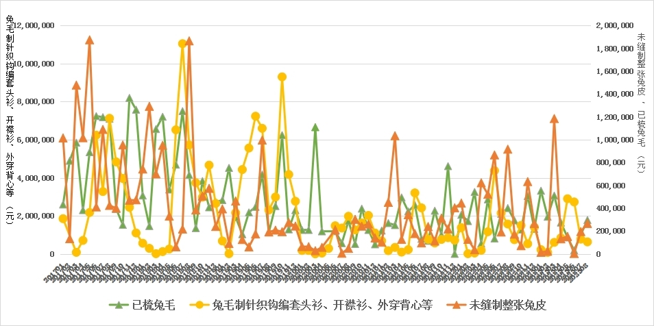 2023年8月份家兔及野兔和其他家兔及野兔(改良種用除外)出口額均為27.05萬(wàn)元,均較上月下降53.68%;鮮、冷、凍家兔或野兔肉及食用雜碎和凍兔肉(不包括兔頭)出口額均為1805.26萬(wàn)元,均較上月上升33.26%(見(jiàn)圖5);未縫制整張兔皮出口額為26.61萬(wàn)元,較上月上升36.17%;已梳兔毛出口額為177.89萬(wàn)元,較上月上升76.64%;兔毛制針織鉤編套頭衫、開(kāi)襟衫、外穿背心等出口額為62.95萬(wàn)元,較上月下降18.66%(見(jiàn)圖6)。